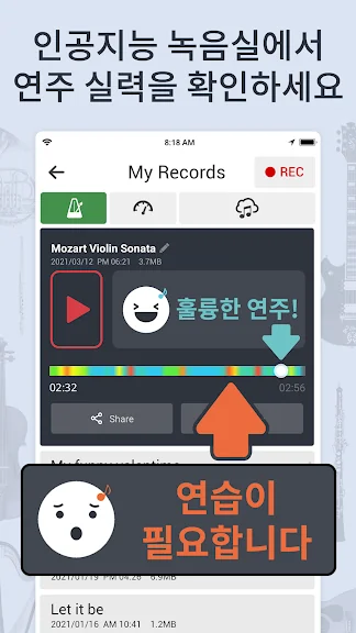 사용자는 메트로놈을 통해 정확한 박자를 맞추고, 튜너 기능으로 악기를 조율할 수 있습니다. 이 외에도 다양한 악기와 음악 장르에 적합한 리듬을 만들고, 연주를 녹음하여 저장 및 공유할 수 있는 기능을 제공합니다. 또한, 악보를 업로드하고 메트로놈과 함께 연습할 수 있어 연습 효율성을 높여줍니다.