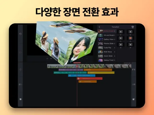 + 디졸브, 밀어내기, 페이드 등 자연스러운 트랜지션과 팝아트 색감의 화려한 그래픽 트랜지션으로 영상의 완성도를 높혀보세요.