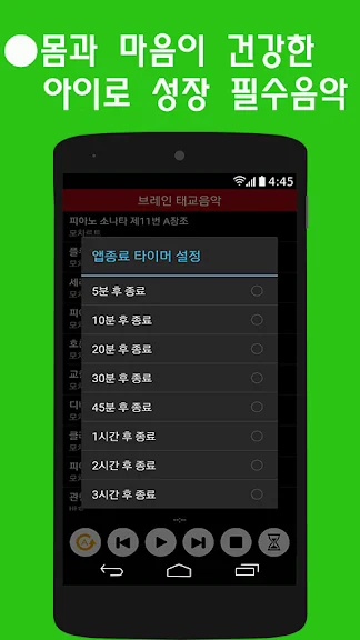 타이머 기능은 지정된 시간 후에 자동으로 응용 프로그램을 끄고 슬라이드 쇼 옵션 응용 프로그램이 자동으로 다음 자장가를 재생할 수 있습니다.