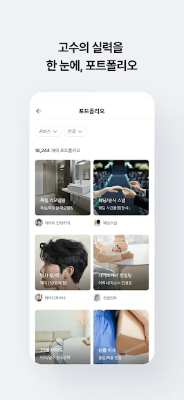 • 이사, 청소, 인테리어, 취미까지! 다양한 분야의 고수 포트폴리오를 한 눈에 확인하세요.