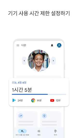 • 기기 사용 시간 제한 설정: Family Link를 사용하면 자녀 기기의 다운타임 및 시간 제한을 설정하여 균형 잡힌 기기 사용 습관을 들이도록 도울 수 있습니다.