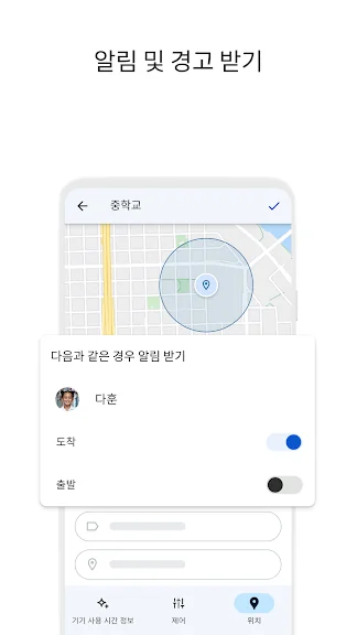 • 알림 받기: Family Link는 자녀가 도착하거나 특정 위치를 떠날 때를 비롯한 중요한 알림을 전송합니다. 기기의 벨소리를 울리고 기기의 배터리 잔량을 확인할 수도 있습니다.