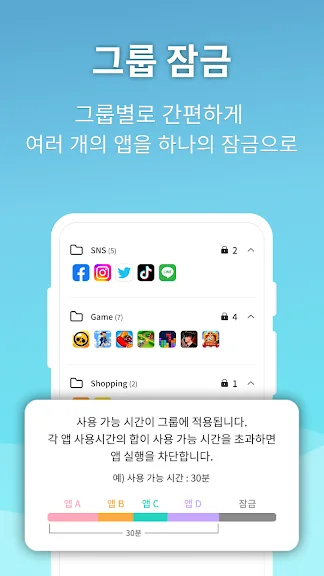 게임, 소셜미디어 등 나에게 불필요한 시간을 빼앗아가는 앱들을 그룹잠금으로 설정하고 나의 소중한 시간을 의미있게 사용해 보세요 ^3^